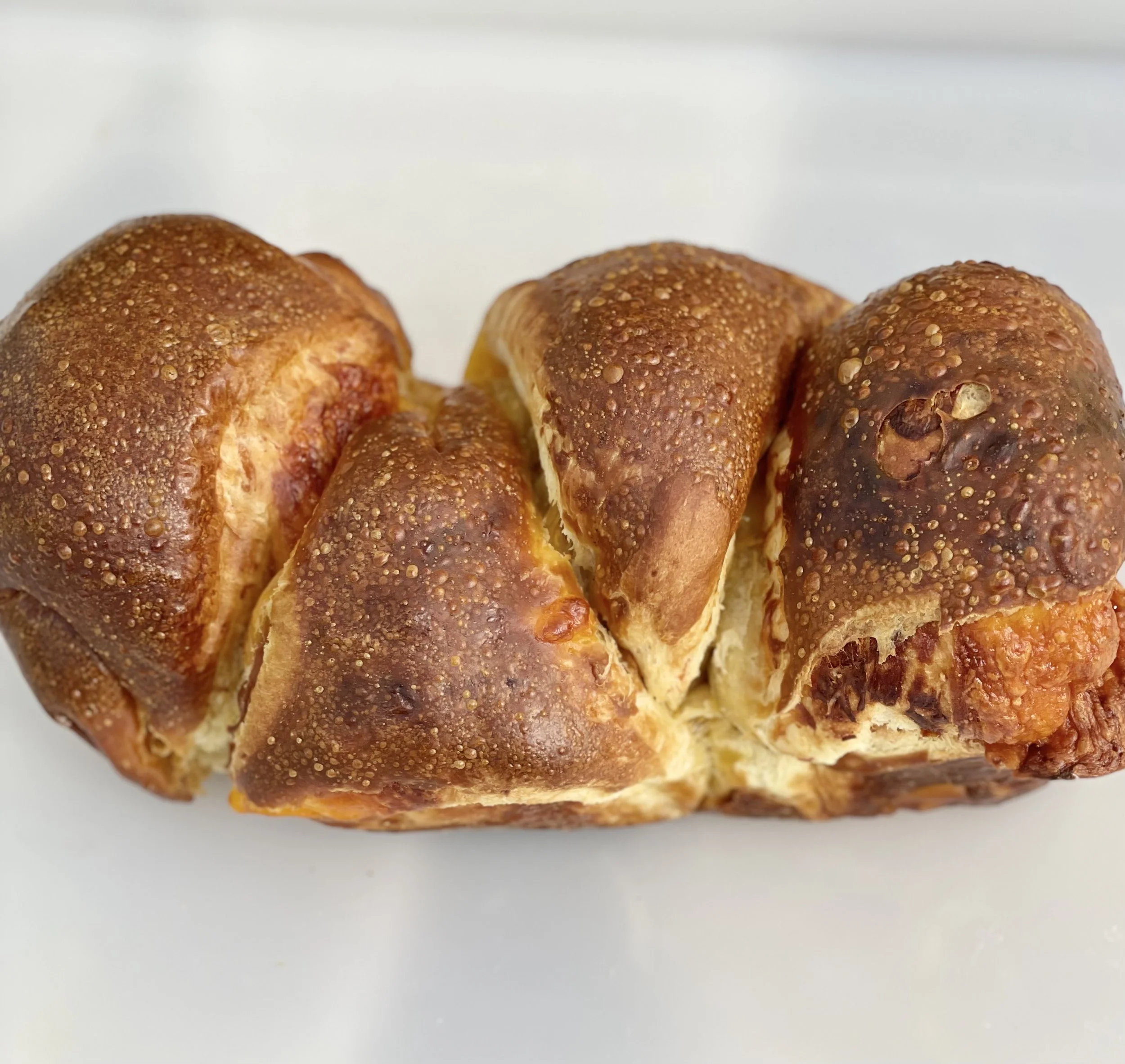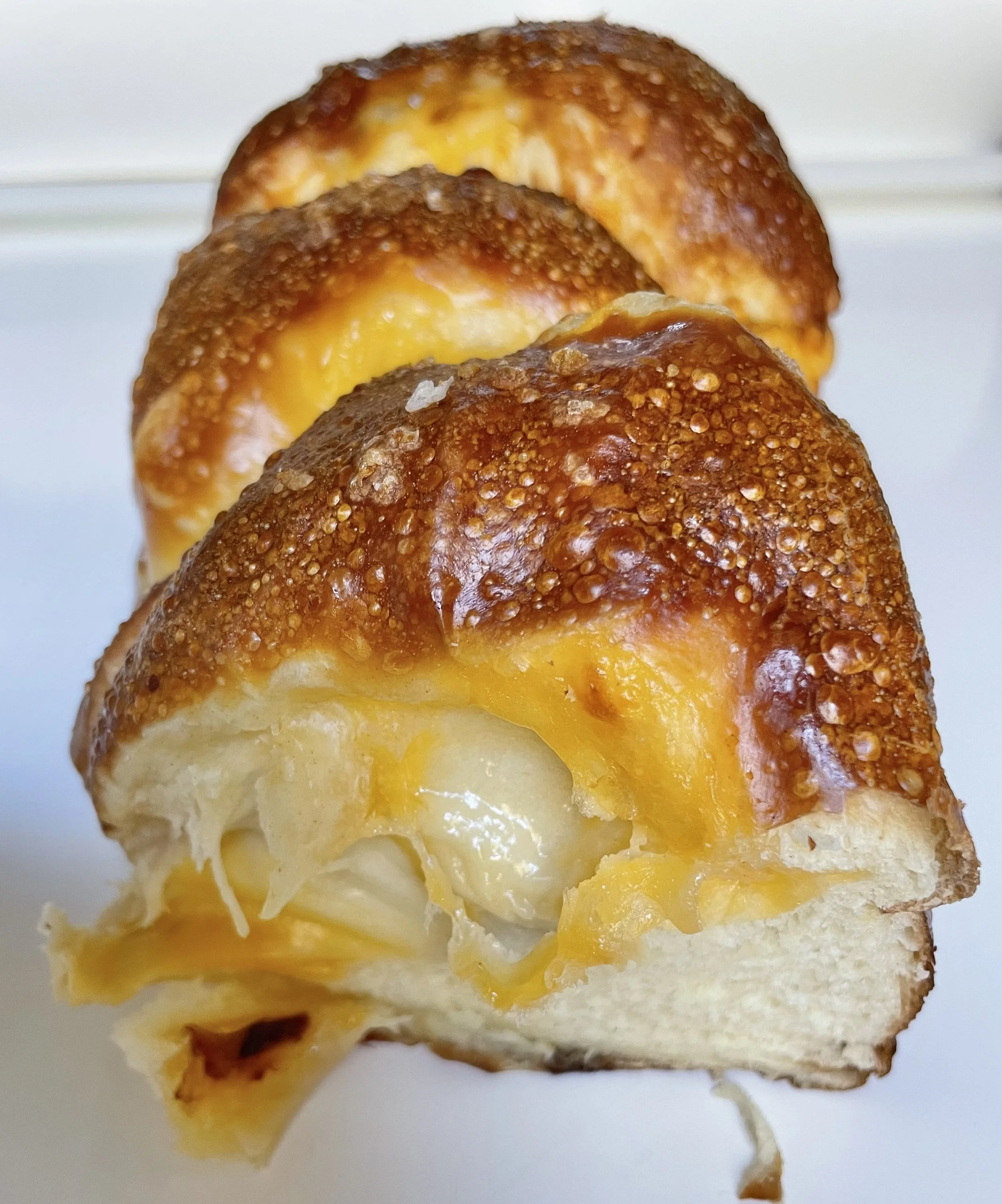 Introducing our Pretzeled Cheese Milk Bread—soft milk bread filled with sharp cheddar and nutty Parmesan cheese, dipped in lye for a golden crust. A savory, cheesy treat perfect for snacking or sharing.